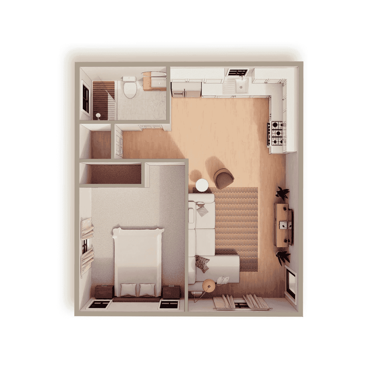 This one-bedroom garage conversion transforms an underutilized space into a stylish and efficient ADU. The bedroom features a spacious closet and ample natural light, while the open-concept living area includes a well-appointed kitchen, a cozy dining nook, and space for a couch and entertainment setup. Thoughtfully designed for comfort and functionality, this layout makes the most of every inch, offering a seamless blend of practicality and modern living.